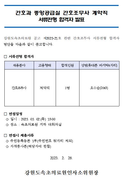 | ¸ðÁýºÐ¾ß | °£È£°ú Áß¾Ó°ø±Þ½Ç °£È£Á¶¹«»ç °è¾àÁ÷ ¼·ùÀüÇü ÇÕ°ÝÀÚ ¹ßÇ¥ |