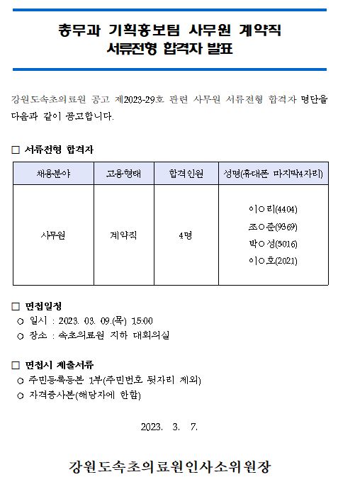 | ¸ðÁýºÐ¾ß | Ãѹ«°ú ±âȹȫº¸ÆÀ »ç¹«¿ø °è¾àÁ÷ ¼·ùÀüÇü ÇÕ°ÝÀÚ ¹ßÇ¥ |
