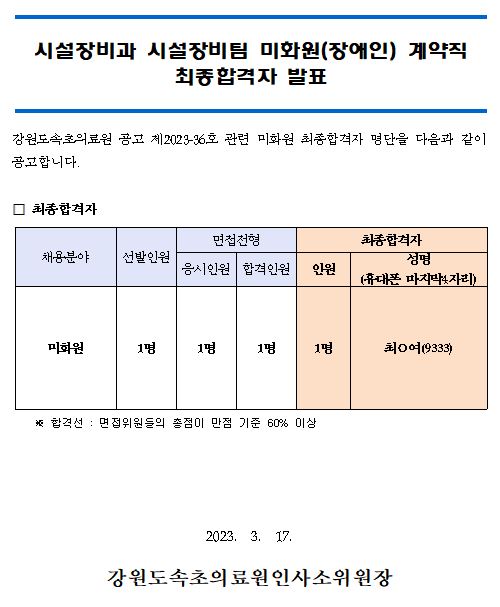| ¸ðÁýºÐ¾ß | ½Ã¼³Àåºñ°ú ½Ã¼³ÀåºñÆÀ ¹ÌÈ¿ø(Àå¾ÖÀÎ) °è¾àÁ÷ ÃÖÁ¾ÇÕ°ÝÀÚ ¹ßÇ¥ |