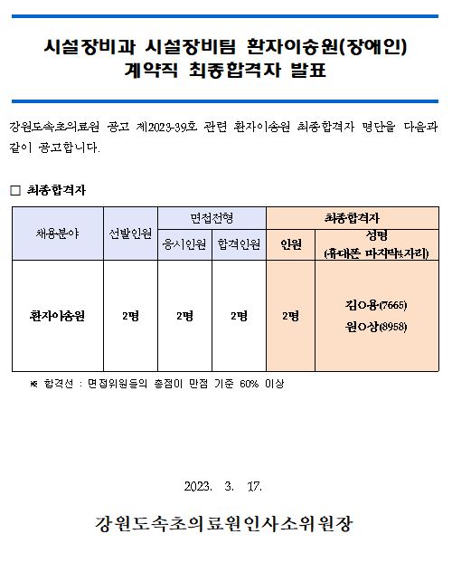 | ¸ðÁýºÐ¾ß | ½Ã¼³Àåºñ°ú ½Ã¼³ÀåºñÆÀ ȯÀÚÀ̼ۿø(Àå¾ÖÀÎ) °è¾àÁ÷ ÃÖÁ¾ÇÕ°ÝÀÚ ¹ßÇ¥ |