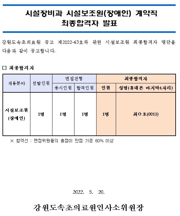¸ðÁýºÐ¾ß | ½Ã¼³Àåºñ°ú ½Ã¼³º¸Á¶¿ø(Àå¾ÖÀÎ) °è¾àÁ÷ ÃÖÁ¾ÇÕ°ÝÀÚ ¹ßÇ¥ |