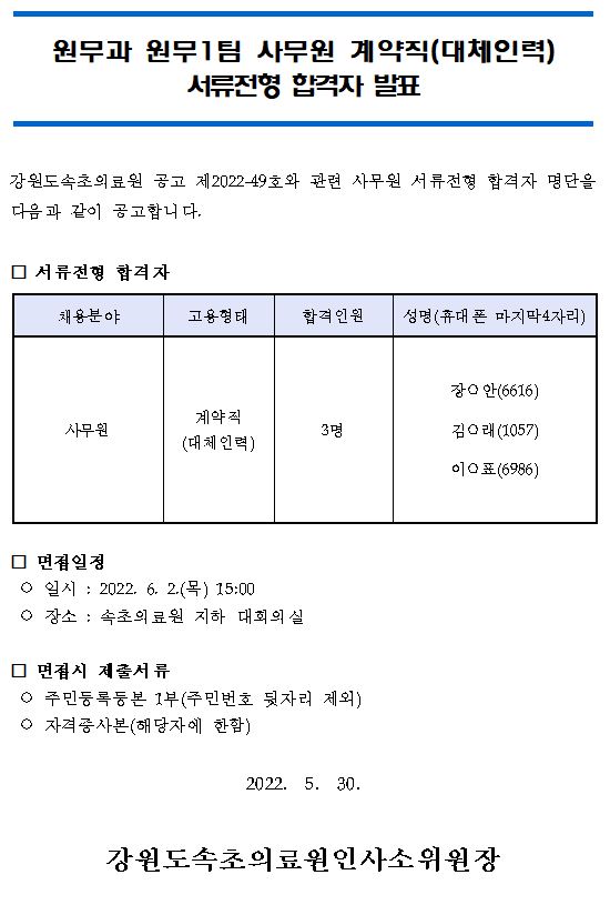 ¸ðÁýºÐ¾ß | ¿ø¹«°ú ¿ø¹«1ÆÀ »ç¹«¿ø °è¾àÁ÷(´ëüÀηÂ) ¼·ùÀüÇü ÇÕ°ÝÀÚ ¹ßÇ¥ |