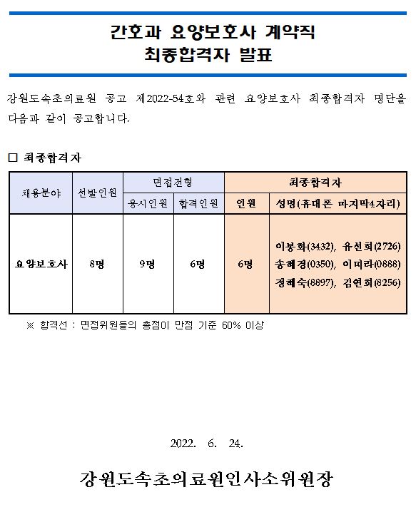 ¸ðÁýºÐ¾ß | °£È£°ú ¿ä¾çº¸È£»ç °è¾àÁ÷ ÃÖÁ¾ÇÕ°ÝÀÚ ¹ßÇ¥ |