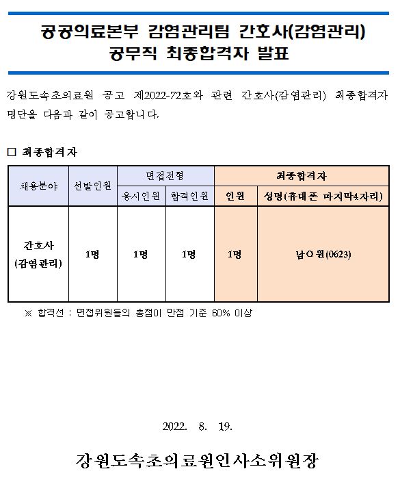 ¸ðÁýºÐ¾ß | °ø°øÀǷẻºÎ °¨¿°°ü¸®ÆÀ °£È£»ç(°¨¿°°ü¸®) °ø¹«Á÷ ÃÖÁ¾ÇÕ°ÝÀÚ ¹ßÇ¥ |