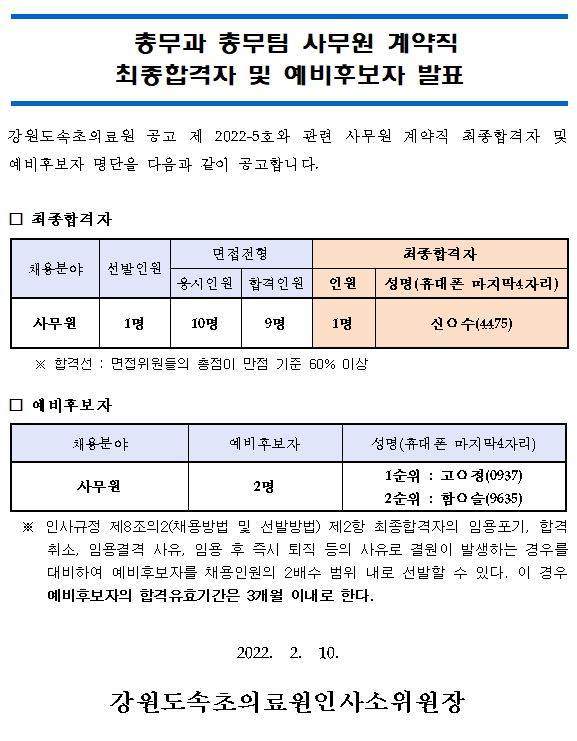 ¸ðÁýºÐ¾ß | Ãѹ«°ú Ãѹ«ÆÀ »ç¹«¿ø °è¾àÁ÷ ÃÖÁ¾ÇÕ°ÝÀÚ ¹× ¿¹ºñÈĺ¸ÀÚ ¹ßÇ¥ |