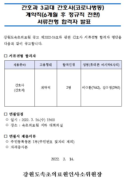 ¸ðÁýºÐ¾ß | °£È£°ú 3±³´ë °£È£»ç(Äڷγªº´µ¿) °è¾àÁ÷(6°³¿ù ÈÄ Á¤±ÔÁ÷ Àüȯ) ¼·ùÀüÇü ÇÕ°ÝÀÚ ¹ßÇ¥ |