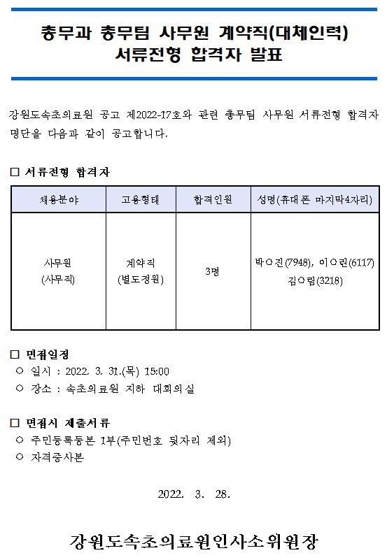 ¸ðÁýºÐ¾ß | Ãѹ«°ú Ãѹ«ÆÀ »ç¹«¿ø °è¾àÁ÷(´ëüÀηÂ) ¼·ùÀüÇü ÇÕ°ÝÀÚ ¹ßÇ¥ |