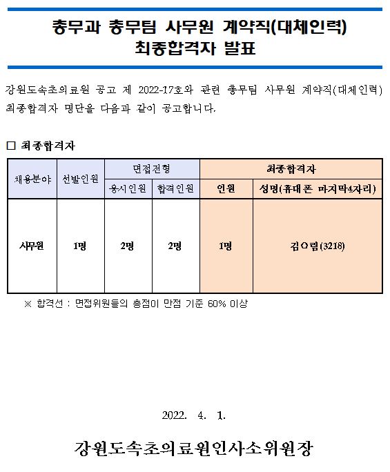 ¸ðÁýºÐ¾ß | Ãѹ«°ú Ãѹ«ÆÀ »ç¹«¿ø °è¾àÁ÷(´ëüÀηÂ) ÃÖÁ¾ÇÕ°ÝÀÚ ¹ßÇ¥ |