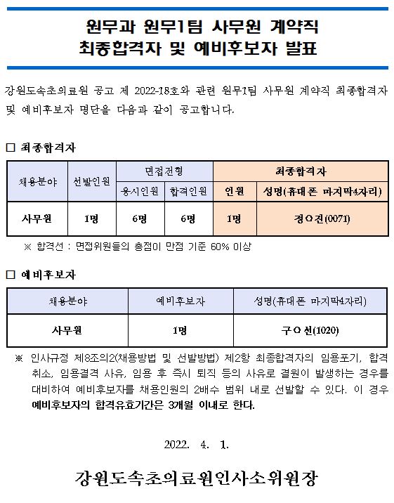 ¸ðÁýºÐ¾ß | ¿ø¹«°ú ¿ø¹«1ÆÀ »ç¹«¿ø °è¾àÁ÷ ÃÖÁ¾ÇÕ°ÝÀÚ ¹× ¿¹ºñÈĺ¸ÀÚ ¹ßÇ¥ |