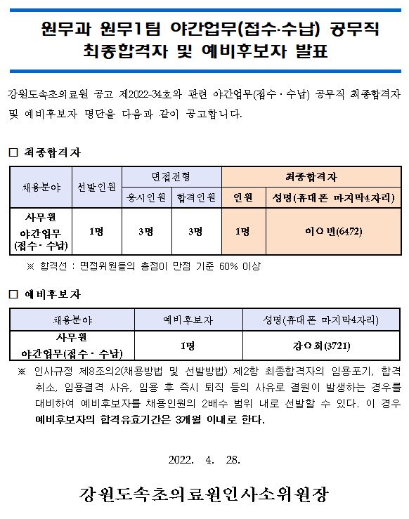 ¸ðÁýºÐ¾ß | ¿ø¹«°ú ¿ø¹«1ÆÀ ¾ß°£¾÷¹«(Á¢¼ö,¼ö³³) °ø¹«Á÷ ÃÖÁ¾ÇÕ°ÝÀÚ ¹× ¿¹ºñÈĺ¸ÀÚ ¹ßÇ¥ |