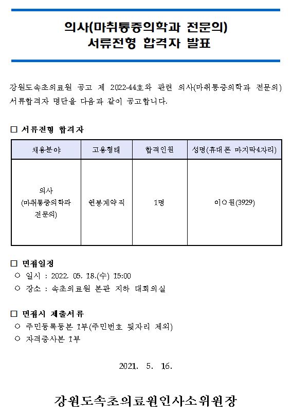¸ðÁýºÐ¾ß | Áø·áºÎ ÀÇ»ç(¸¶ÃëÅëÁõÀÇÇаú Àü¹®ÀÇ) ¼·ùÀüÇü ÇÕ°ÝÀÚ ¹ßÇ¥ |