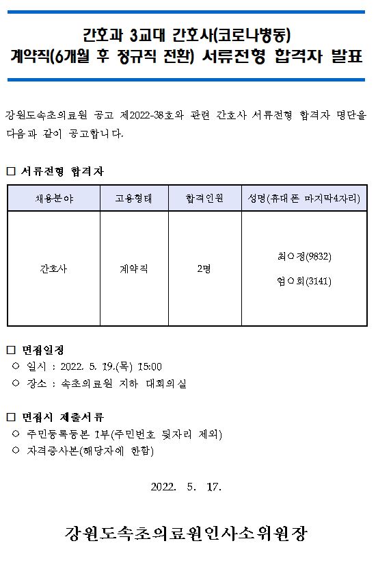 ¸ðÁýºÐ¾ß | °£È£°ú 3±³´ë °£È£»ç(Äڷγªº´µ¿) °è¾àÁ÷(6°³¿ù ÈÄ Á¤±ÔÁ÷ Àüȯ) ¼·ùÀüÇü ÇÕ°ÝÀÚ ¹ßÇ¥ |