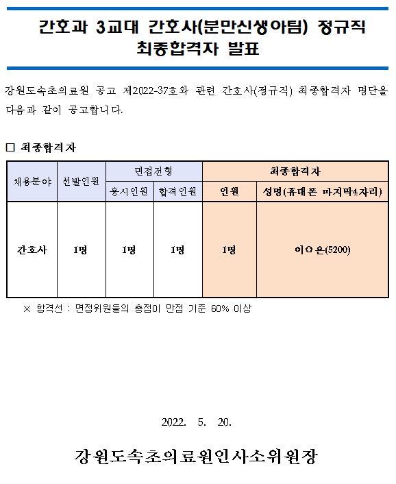 ¸ðÁýºÐ¾ß | °£È£°ú 3±³´ë °£È£»ç(ºÐ¸¸½Å»ý¾ÆÆÀ) Á¤±ÔÁ÷ ÃÖÁ¾ÇÕ°ÝÀÚ ¹ßÇ¥ |