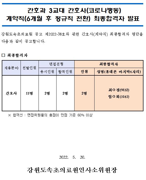 ¸ðÁýºÐ¾ß | °£È£°ú 3±³´ë °£È£»ç(Äڷγªº´µ¿) °è¾àÁ÷(6°³¿ù ÈÄ Á¤±ÔÁ÷ Àüȯ) ÃÖÁ¾ÇÕ°ÝÀÚ ¹ßÇ¥ |